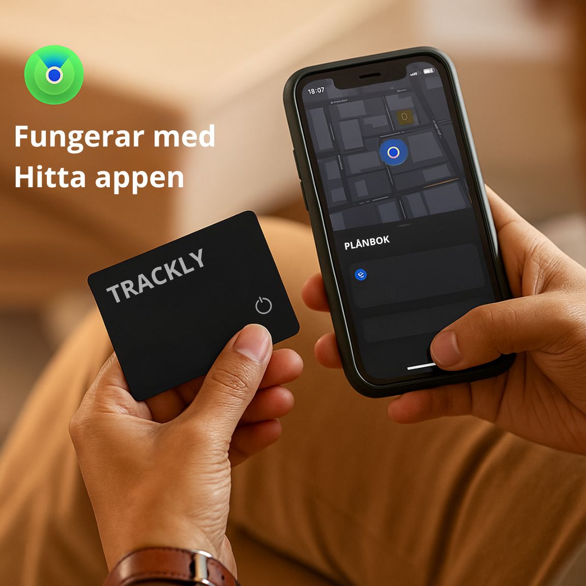 Trackly är fullt integrerad i Apples Hitta-app (Find My). Se var din plånbok, väska eller ditt pass är direkt på din iPhone – utan extra appar. Apple enheter i närheten hjälper dig att hitta dina saker via det krypterade Hitta-nätverket.